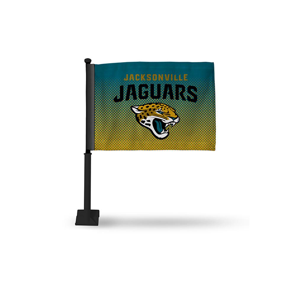 Jacksonville Jaguars NFL Car Flag (Black Pole) Two-sided car flag printed with your favorite team logo. Made with Superior material is UV fade resistant, 80 denier and 100% polyester and Double-stiched with Permacoretex-60 thread. Two-sided car flag printed with your favorite team logo All components made in the USA Superior material is UV fade resistant, 80 denier and 100% polyester Double-stiched with Permacoretex-60 thread The best way to show your team spirit on the way to the game