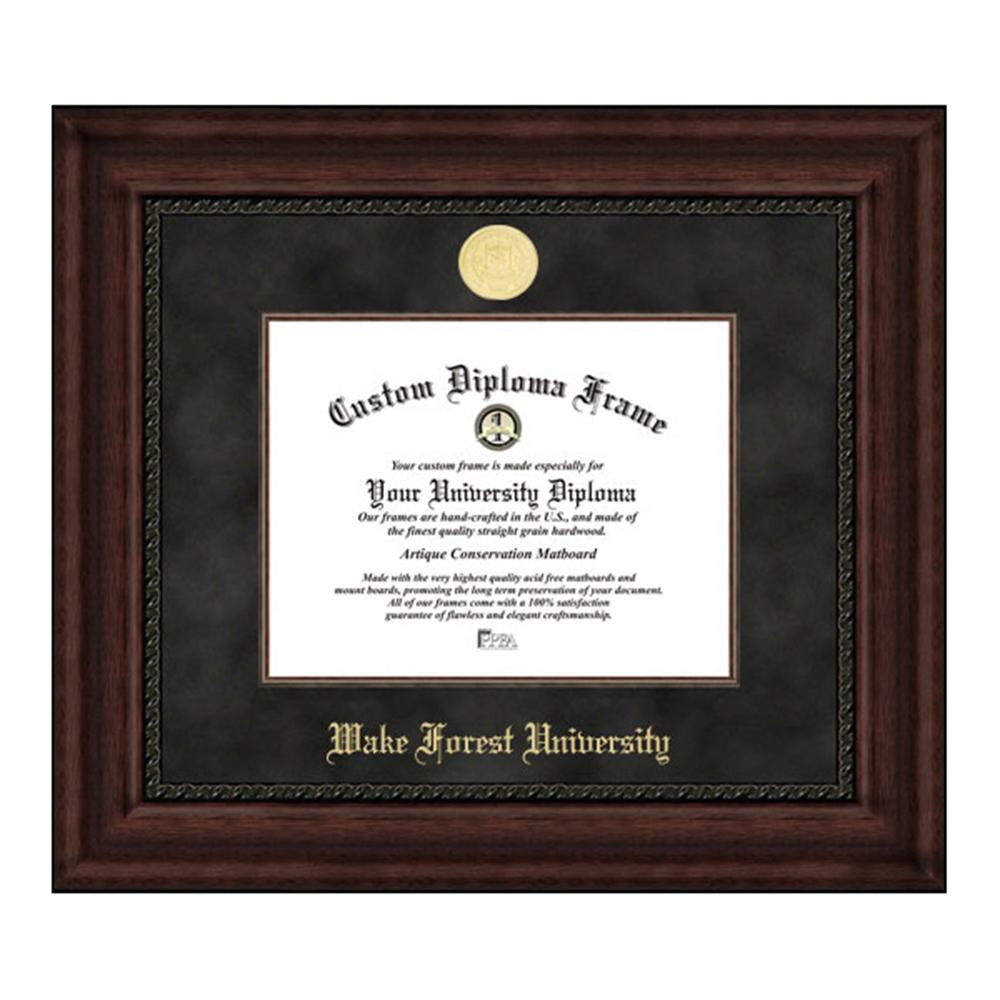 Our Executive frame is custom made of high quality wood ,an intricate rope pattern on the frame's inner edge, rich black suede matting and the wood fillet liner (finished to match the frame) are further innovations designed to highlight your diploma in a style usually seen only in fine art galleries. The back of the frame is completely finished with a heavy duty dustcover, wall bumpers and a hanger. Custom made to fit any diploma size.