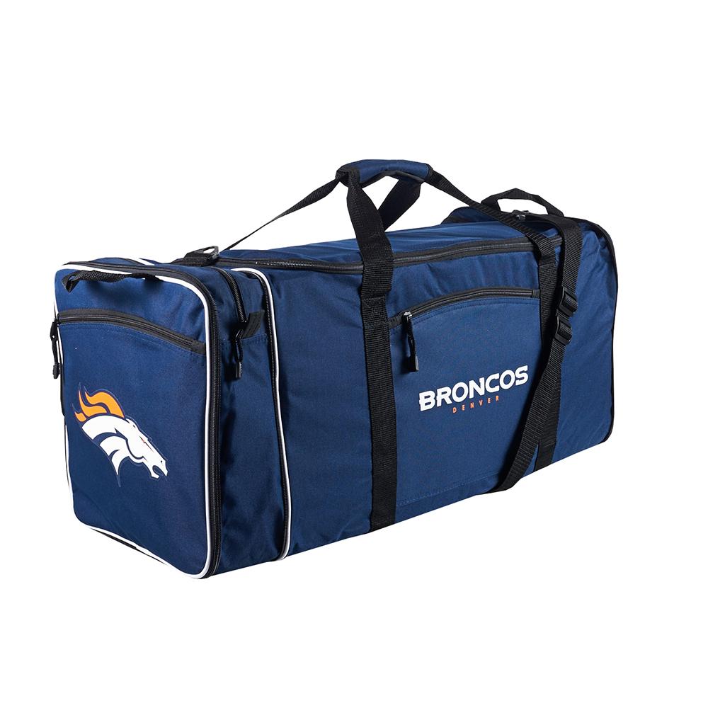 Denver Broncos NFL Steal Duffel Bag (Navy) This Officially licensed Duffel Bag by The Northwest Company is sure to be a Steal! Featuring your favorite team’s logo and colors, at full size, this duffel has front and side pockets along with a detachable and adjustable cross body, padded shoulder strap. Besides all your personal belongings fitting into the duffel bag at full size at 12H x 28L x 11”W, this duffel compacts down into 12 x 11 x 1.25 size for travel stowing and storage! All nylon zippers have metal heads. 600D Polyester. Spot clean only. Spot clean only. 600D Polyester Adjustable cross body, padded shoulder strap Front and side pockets Officially Licensed