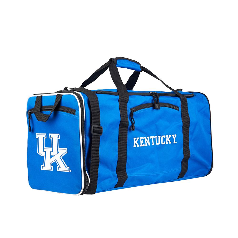 Kentucky Wildcats NCAA Steal Duffel Bag (Navy) This Officially licensed Duffel Bag by The Northwest Company is sure to be a Steal! Featuring your favorite team’s logo and colors, at full size, this duffel has front and side pockets along with a detachable and adjustable cross body, padded shoulder strap. Besides all your personal belongings fitting into the duffel bag at full size at 12H x 28L x 11”W, this duffel compacts down into 12 x 11 x 1.25 size for travel stowing and storage! All nylon zippers have metal heads. 600D Polyester. Spot clean only. Spot clean only. 600D Polyester Adjustable cross body, padded shoulder strap Front and side pockets Officially Licensed