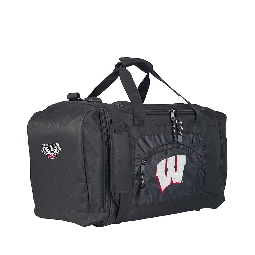 Wisconsin Badgers NCAA Roadblack Duffel Bag (Black/Black) Carry around this Officially Licensed “Roadblock” Duffel Bag by The Northwest Company! Pick up the straps with the securely latched handles as you’re heading out on the road; it’s the perfect size for any of your belongings! There is a large front zippered compartment, along with three exterior pockets, with a ventilated wet/dry pocket! Keep the padded shoulder strap on, or detach it – it’s your call! Show off your favorite team with this 20L x 11.5W x 13H duffel bag. 600D Polyester. Spot clean only. Spot clean only. Ventilated wet/dry pocket Large front zippered compartment Three exterior pockets Officially Licensed