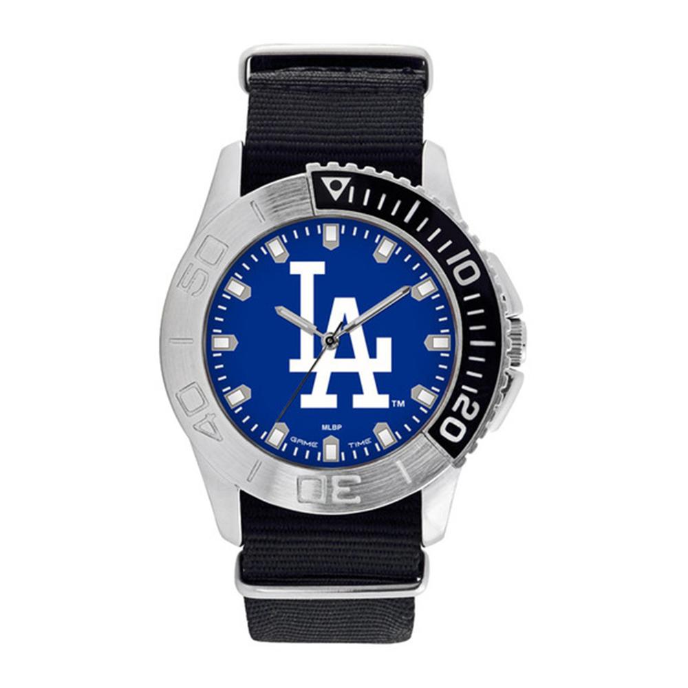 Los Angeles Dodgers MLB Mens Starter Series Quartz Analog Watch The Men’s Starter Watch by Game Time is a great looking and durable timepiece at a fantastic price. Ideally this watch can be worn every day. It features your favorite team logo in full color on a team colored dial. This watch is unique from traditional watches because of the strong and slim nylon strap that adjusts to your wrist to fit nice and snug. It is water resistant and is backed from Game Time’s limited lifetime warranty. Strong and Slim Nylon Strap Scratch Resistant Mineral Crystal Stainless steel case back Japan quartz movement Water resistant to 3 ATM