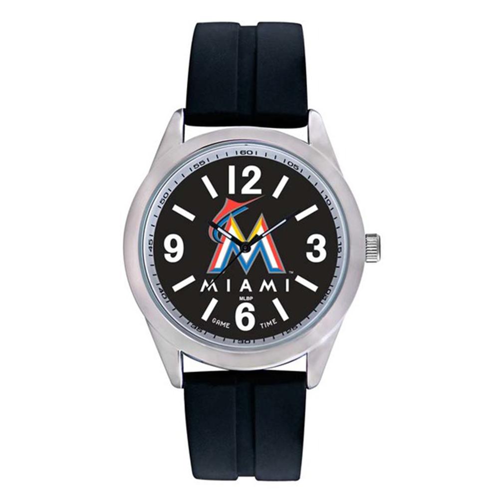 Miami Marlins MLB Mens Varsity Series Quartz Analog Watch Represent your favorite team on and off the field with Game Time's Varsity Series Watch. This watch features your favorite teams logo on a team color dial, a Silicon band, and stainless steel case back. Officially Licensed Three Hand Movement Silicone Band Shock Resistant Water Resistant to 3 ATM